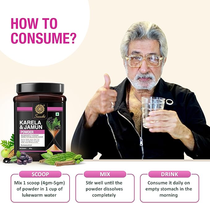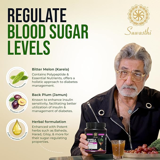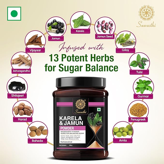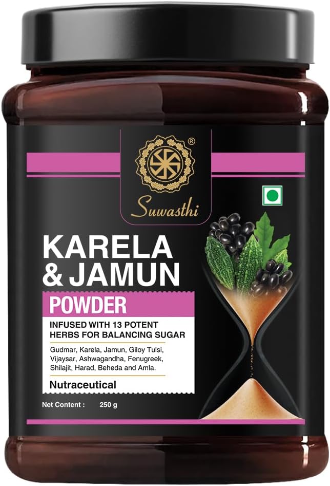 - 1. Suwasthi Karela Jamun powder is a unique combination of bitter gourd (karela), Indian blackberry(Jamun) to helps maintaining sugar management..